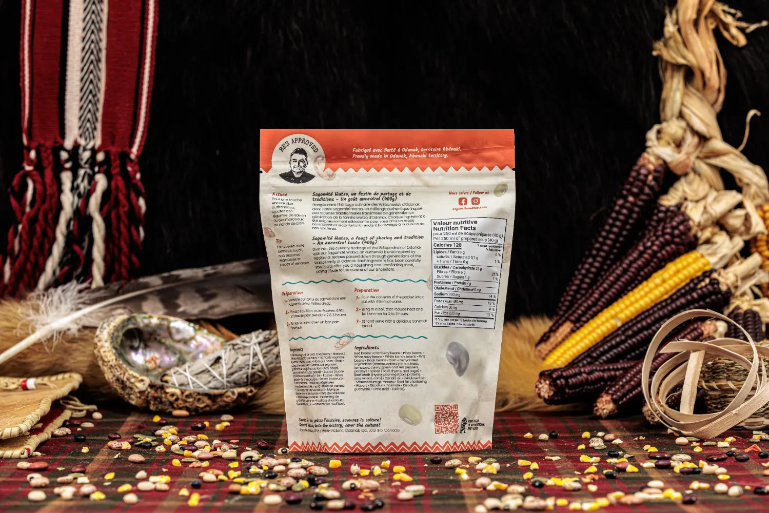 Watso Soup is a traditional soup from the culinary heritage of the Abenaki of Odanak. A soup made from 9 varieties of beans, Hominy corn, spices and dehydrated vegetables. Just add all the ingredients to a pot of boiling water.